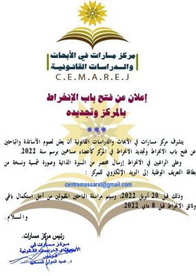 يتشرف مركز مسارات في الأبحاث والدراسات القانونية أن يعلن لعموم الأساتذة والباحثين عن فتح باب [...]